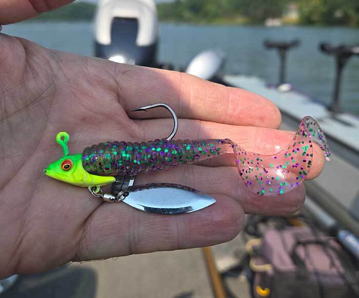 I’ll also use an underspin jighead with a willow blade and a K-5 Grub, Pulse-R, or Moxi as mentioned above. This can be worked a lot quicker to cover more water and entice aggressive fish. With the trolling motor set on spotlock, I’ll fan cast with the underspin/plastic and jig/plastic combos for about 15 minutes. If nothing happens, I’ll move on down the breakline in search of another sweet spot to stop, drop in the dead sticks, and cast around again.